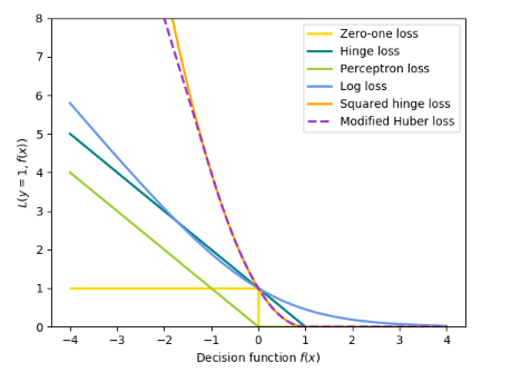 y是预测值,在-1到+1之间,t为目标值(-1或+1)。其含义为y的值在-1和+1之间就可以了,并不鼓励|y|>1,即并不鼓励分类器过度自信,让某个正确分类的样本的距离分割线超过1并不会有任何奖励,从而使分类器可以更专注于整体的分类误差。