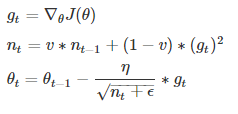 Nesterov 加速梯度法(NAG)是一种能给予梯度项上述「预测」功能的方法。我们知道,我们使用动量项γvt-1 来「移动」参数项θ。通过计算θ-γvt-1,我们能够得到一个下次参数位置的近似值——也就是能告诉我们参数大致会变为多少。那么,通过基于未来参数的近似值而非当前的参数值计算相得应罚函数 J(θ-γvt-1) 并求偏导数,我们能让优化器高效地「前进」并收敛: