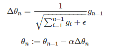 Adagrad –> Adadelta 由于Adagrad 使用了之前所有梯度的平方,会导致训练到后面梯度为0,因此,在Adadelta中只用前面一段时间的下降梯度的配方