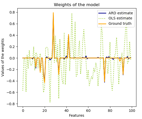 这可以通过对模型的超参数引入 uninformative priors ( 不知情的先验 ) 来完成。Ridge Regression 中使用的img 正则化等价于在精度为?的参数 w 之前,在高斯下找到最大 a-postiori 解。而不是手动设置 lambda ,可以将其视为从数据估计的随机变量。